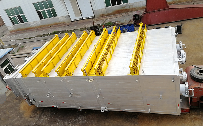 2】、降溫幅度最大【進料溫度約750℃,出料溫度約150℃,冷卻物料溫差約600℃】、設(shè)備重量最重【設(shè)備凈重約70噸,運行重量約160噸】、設(shè)備體積最大【長×寬×高≈4.8米×2.8米×11米】的立式水循環(huán)冷卻設(shè)備。